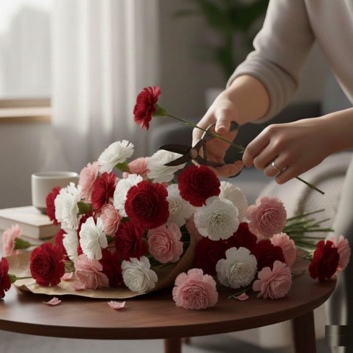 Caring for carnations is refreshingly straightforward, which is part of their appeal. I clean vase and fresh, room-temperature water. I re-cut the stems at a sharp angle and remove all leaves that would sit below the waterline.