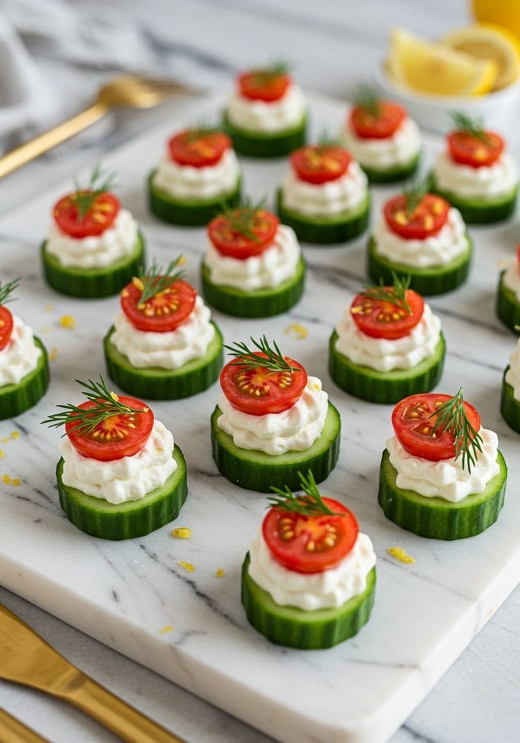 Sliced cucumbers topped with cream cheese create a refreshing and crunchy snack.