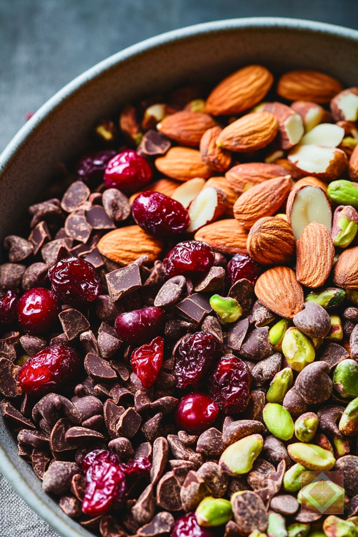 Combine peanuts, raisins, cereal, and a few chocolate chips in a bowl. This snack provides both energy and a little sweetness.