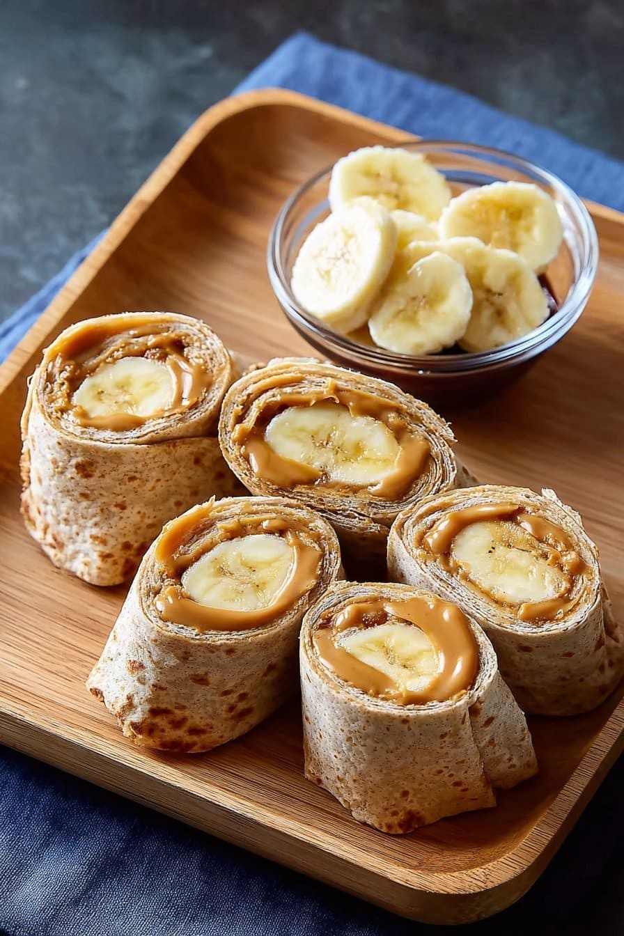 Spread peanut butter over a tortilla, add a banana, and roll it up. Then slice the wrap into smaller pieces for an easy snack.