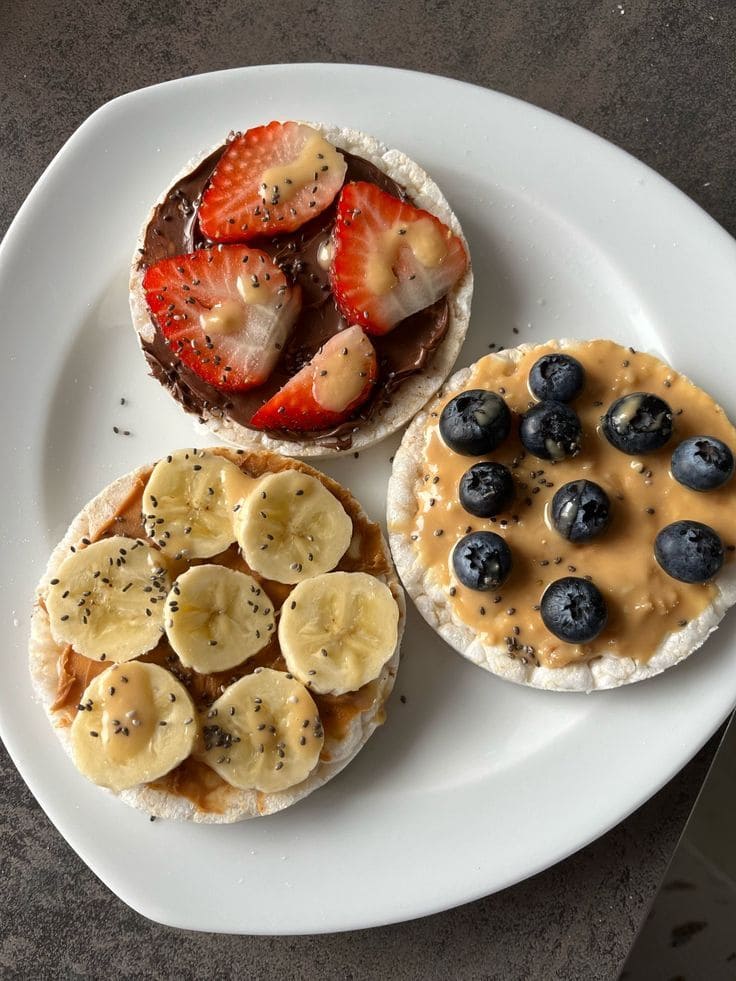 Rice cakes spread with peanut butter make a crunchy and light snack. The rice cake provides texture while the peanut butter adds richness and protein.