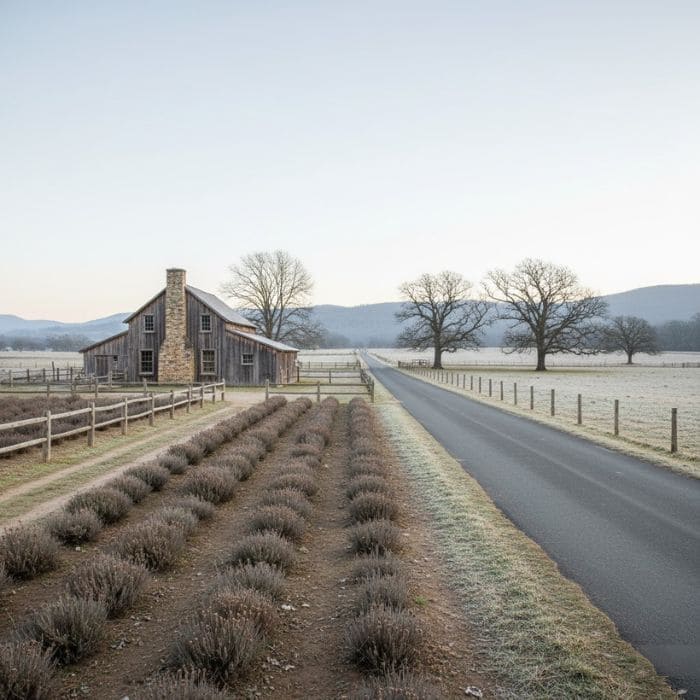 The farm sat on a quiet stretch of rural road, surrounded by low fencing and rows of winter herbs.