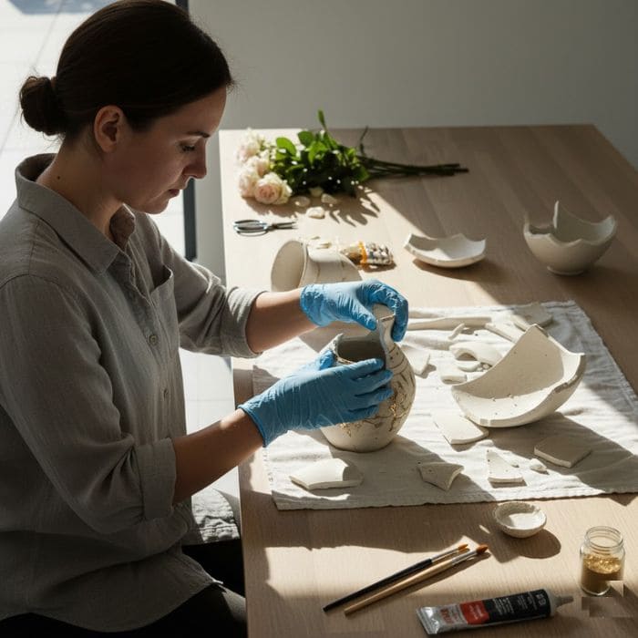 I gathered everything slowly: a strong ceramic adhesive, fine brushes, gold-colored repair powder, gloves, a clean cloth.